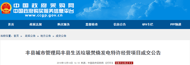 江蘇省豐縣生活垃圾焚燒發(fā)電特許經(jīng)營項目發(fā)布成交公告,中國光大綠色環(huán)保有限公司成為中標的社會資本方,生活垃圾處理服務(wù)費單價為65元/噸。