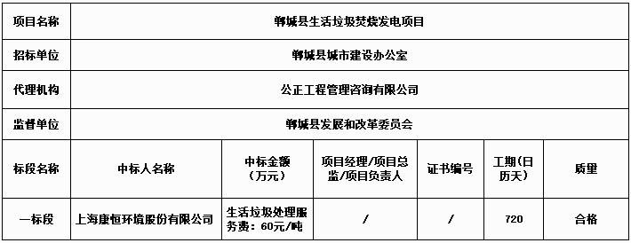 河南省周口市鄲城縣生活垃圾焚燒發(fā)電項(xiàng)目發(fā)布了中標(biāo)公告,上海康恒環(huán)境股份有限公司成為中標(biāo)的社會(huì)資本方,生活垃圾處理服務(wù)費(fèi)為60元/噸。