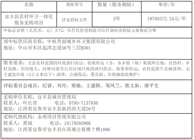 原標(biāo)題:1979萬(wàn)元/年,江西宜豐縣農(nóng)村環(huán)衛(wèi)項(xiàng)目中標(biāo)公示