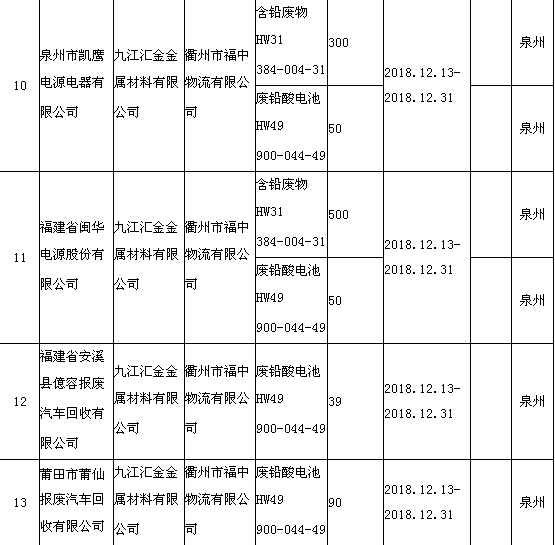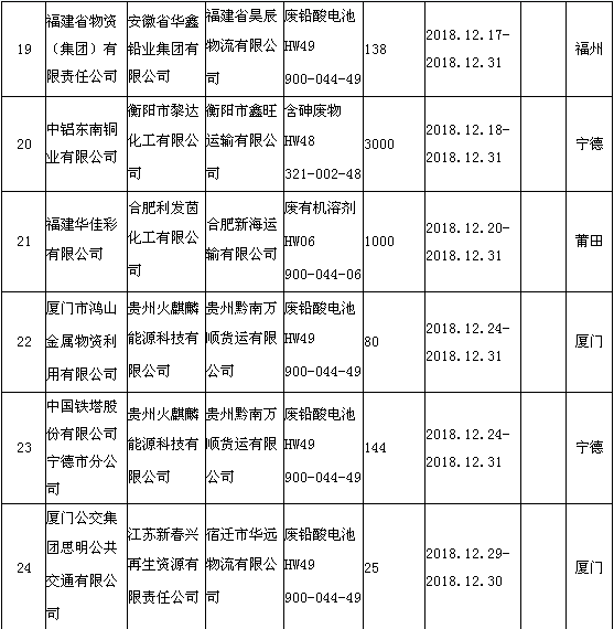 日前福建省環(huán)境保護廳發(fā)布了《2018年12月福建省危險廢物跨省轉(zhuǎn)移情況公告》,共有24項,具體內(nèi)容如下: