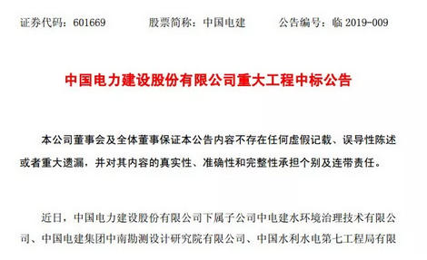 2019年1月24日,中國電建發(fā)布公告表示,中國電建水環(huán)境治理技術(shù)有限公司中標(biāo)了2019年龍崗區(qū)龍崗河流域、觀瀾河流域消除黑臭及河流水質(zhì)保障工程項目,中標(biāo)金額約為97.31億元人民幣,項目總工期為334天。