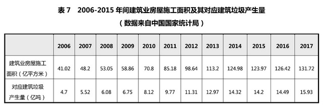 按照我國《民用建筑設(shè)計(jì)通則》,重要建筑和高層建筑主體結(jié)構(gòu)的耐久年限為100年,一般建筑為50~100年?!笆晃濉逼陂g,全國共有46億平方米建筑被拆除,其中20億平方米建筑在拆除時壽命小于40年。據(jù)測算,每10000平米建筑施工面積平均產(chǎn)生550噸建筑垃圾,建筑施工面積對城市建筑垃圾產(chǎn)量的貢獻(xiàn)率為48%。保守估計(jì),2017年全國共計(jì)產(chǎn)生建筑垃圾15.93億噸。