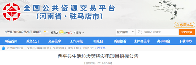 2019年2月28日,河南省駐馬店市西平縣生活垃圾焚燒發(fā)電項(xiàng)目發(fā)布招標(biāo)公告。