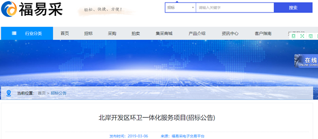 福建省北岸開發(fā)區(qū)環(huán)衛(wèi)一體化服務(wù)項(xiàng)目發(fā)布招標(biāo)公告。