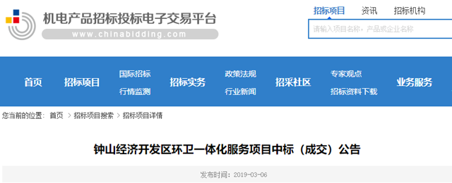 貴州省鐘山經(jīng)濟(jì)開發(fā)區(qū)環(huán)衛(wèi)一體化服務(wù)項(xiàng)目發(fā)布中標(biāo)(成交)公告,福建龍馬環(huán)衛(wèi)裝備股份有限公司成為中標(biāo)的社會資本方。