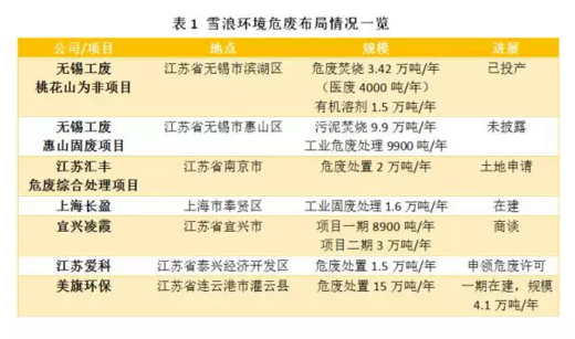 2016年11月,雪浪環(huán)境牽頭發(fā)起設(shè)立江蘇無錫雪浪金茂環(huán)保產(chǎn)業(yè)投資企業(yè)(有限合伙),基金總投資為5億元,雪浪環(huán)境通過設(shè)置企業(yè)并購基金“無錫雪浪金茂”進(jìn)一步布局危廢市場(chǎng)。2017年7月,無錫雪浪金茂通過股權(quán)轉(zhuǎn)讓的形式收購江蘇愛科65%的股權(quán)。2017年8月,無錫雪浪金茂通過股權(quán)轉(zhuǎn)讓的形式收購美旗環(huán)保20%的股權(quán)。美旗環(huán)保擬投資建設(shè)灌云工業(yè)廢物綜合處理中心項(xiàng)目以處理灌云縣臨港產(chǎn)業(yè)區(qū)內(nèi)危廢為主,兼顧灌云、灌南、徐圩新區(qū)、響水等地危險(xiǎn)廢物綜合處理,總設(shè)計(jì)處理規(guī)模15萬噸/年,其中工程一期處理規(guī)模4.1萬噸/年。