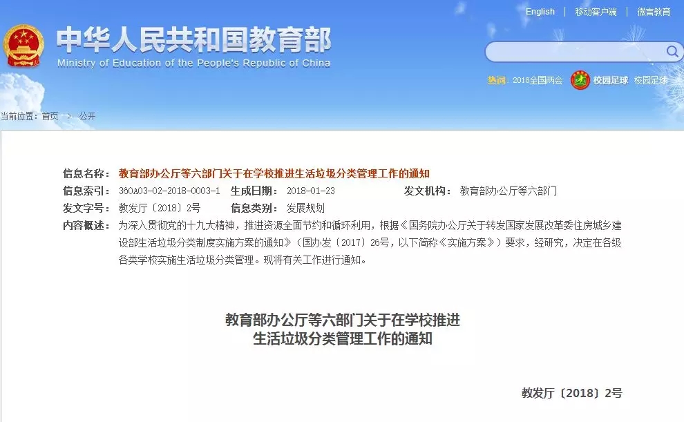 (三)主要目標(biāo)。各地教育部門和學(xué)校要通過多種形式全面開展生活垃圾分類知識(shí)教育工作,規(guī)范生活垃圾分類投放收集貯存工作,探索建立生活垃圾分類宣傳教育工作長效機(jī)制和校內(nèi)生活垃圾分類投放收集貯存的管理體系。到2020年底,各學(xué)校生活垃圾分類知識(shí)普及率要達(dá)到100%。