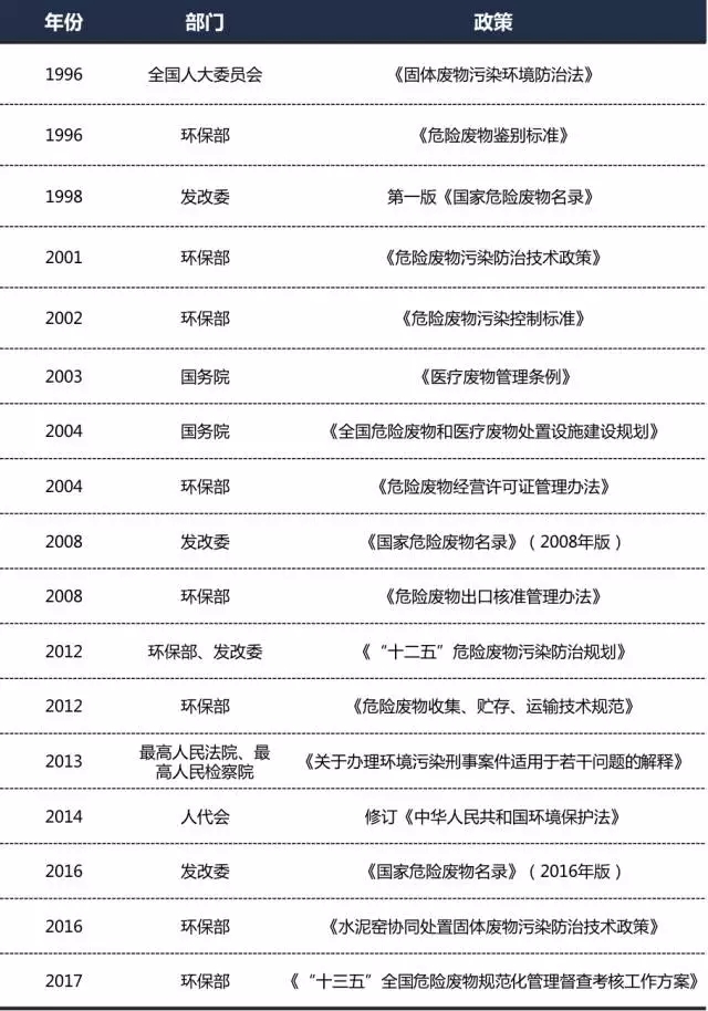 危廢政策不斷出臺,尤其是省級細則落地:1)2017年環(huán)保部出臺“十三五”全國危險廢物規(guī)范化管理督查考核工作方案,各省近期均推出省級危廢規(guī)范化管理督查方案;2)《國家危險廢物名錄》自2016年8月1日起施行;新修訂的《固體廢物污染環(huán)境防治法》取消危險廢物省內(nèi)轉(zhuǎn)移審批手續(xù);3)2016年最高司法機關(guān)就環(huán)境污染犯罪出臺專門司法解釋;4)2018年起實施《環(huán)境保護稅法》,危廢稅額1000元/噸;5)環(huán)保部發(fā)布《水泥窯協(xié)同處置固體廢物污染防治技術(shù)政策》,支持水泥窯協(xié)同處置。