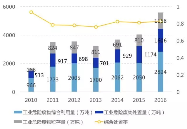 在環(huán)保監(jiān)管力度增強,各省均推出省級督查方案背景下,危廢處置剛需再次提升,尤其是要求進入規(guī)范渠道處置的量增加。但市場情況是,實際產(chǎn)生量遠大于統(tǒng)計量(披露16年5347萬噸,預(yù)計實際8000萬噸),低綜合利用處置率(83%),低有效利用率(25%),導(dǎo)致整體危廢的處置供不應(yīng)求。