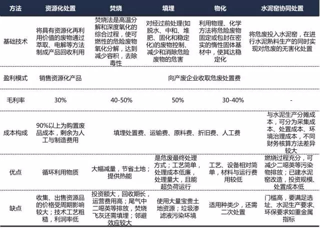 我國危廢處理方式基本以無害化處理及資源化利用為主。資源化利用的模式為危廢資源化企業(yè)向上游產(chǎn)廢企業(yè)收取有利用價值的廢物,再提純生產(chǎn)為資源化產(chǎn)品,收入來自于銷售產(chǎn)品,盈利受上游廢物價格及下游金屬價格影響。無害化處置是處置企業(yè)向產(chǎn)廢企業(yè)收取費用,主要包括焚燒、填埋、物化,水泥窯協(xié)同處置也可列為無害化處置的方法。無害化毛利較高,焚燒毛利可達40%以上,填埋毛利50%以上。水泥窯協(xié)同處置與水泥生產(chǎn)共攤成本,邊際成本較低。